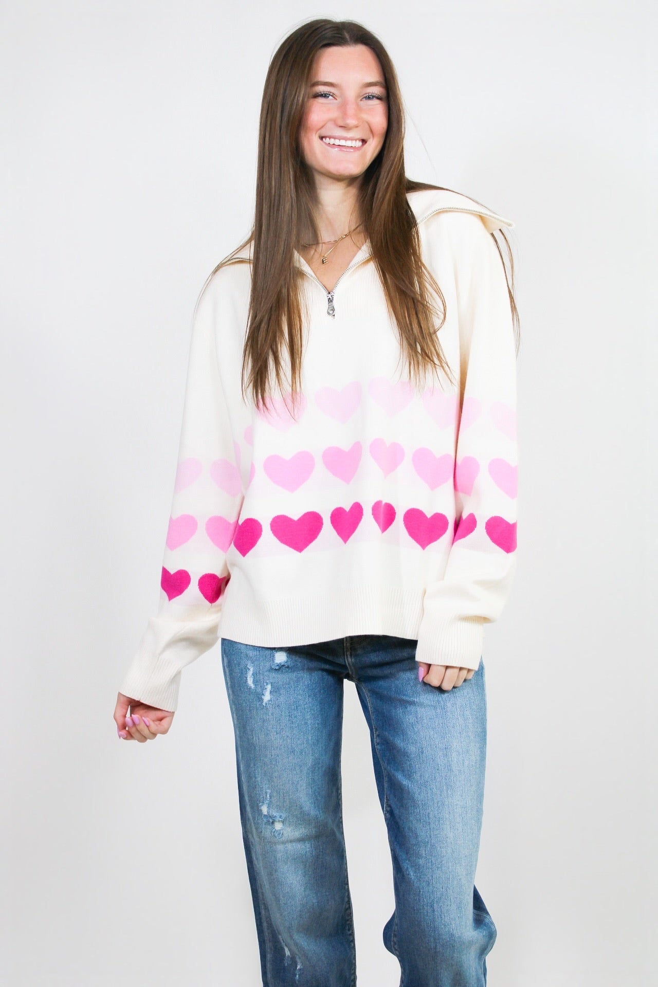 Emily is 5'6 wearing a size medium.- Half Zip.- Ribbed Trimming.- Multicolor Hearts.