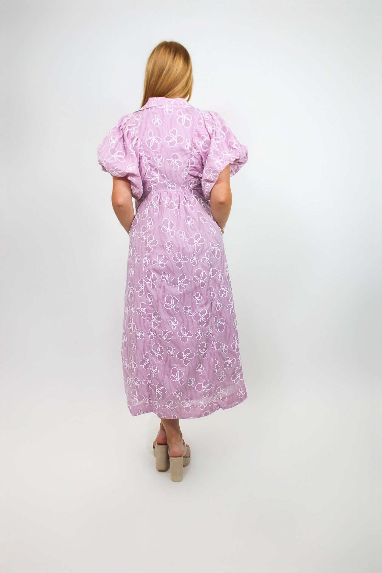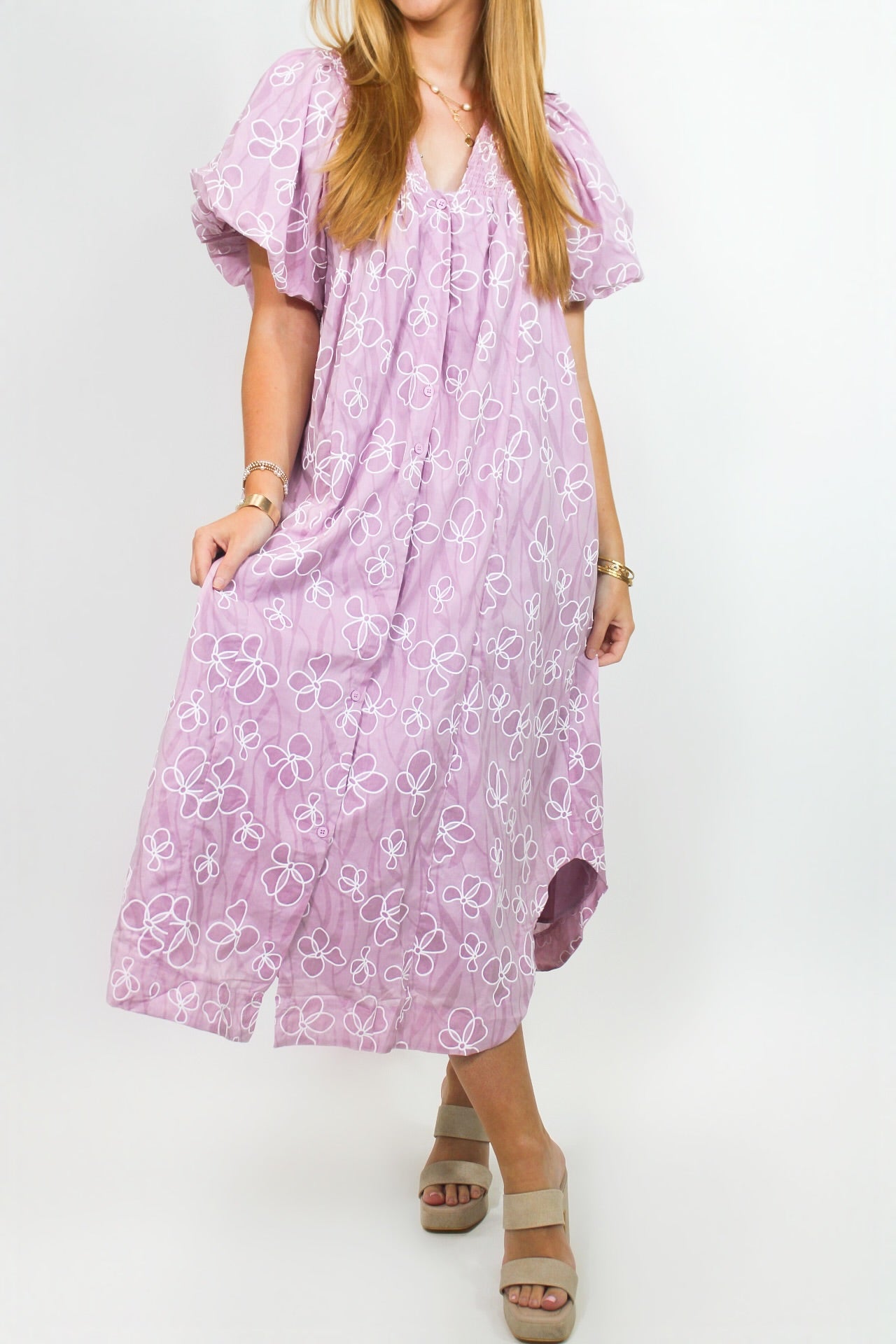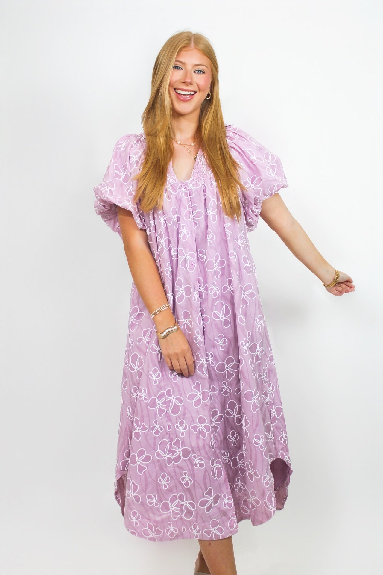 Courtney is 5'6 wearing a size small.- White Floral Stitching.- V-Neck.- True to Size.
