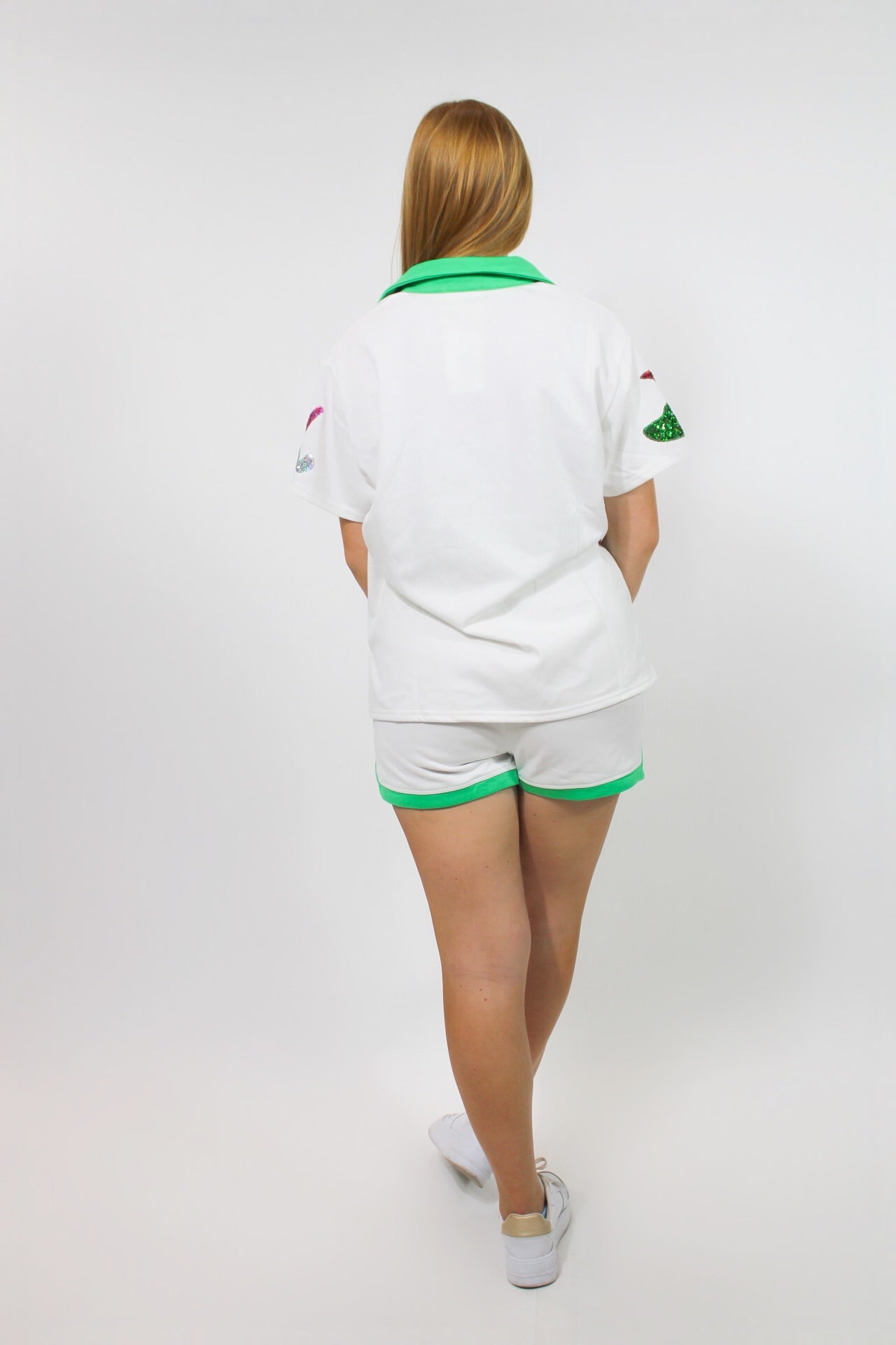 Courtney is 5'6 wearing a small.- Two piece set.- Sequin details.- Drawstring shorts.