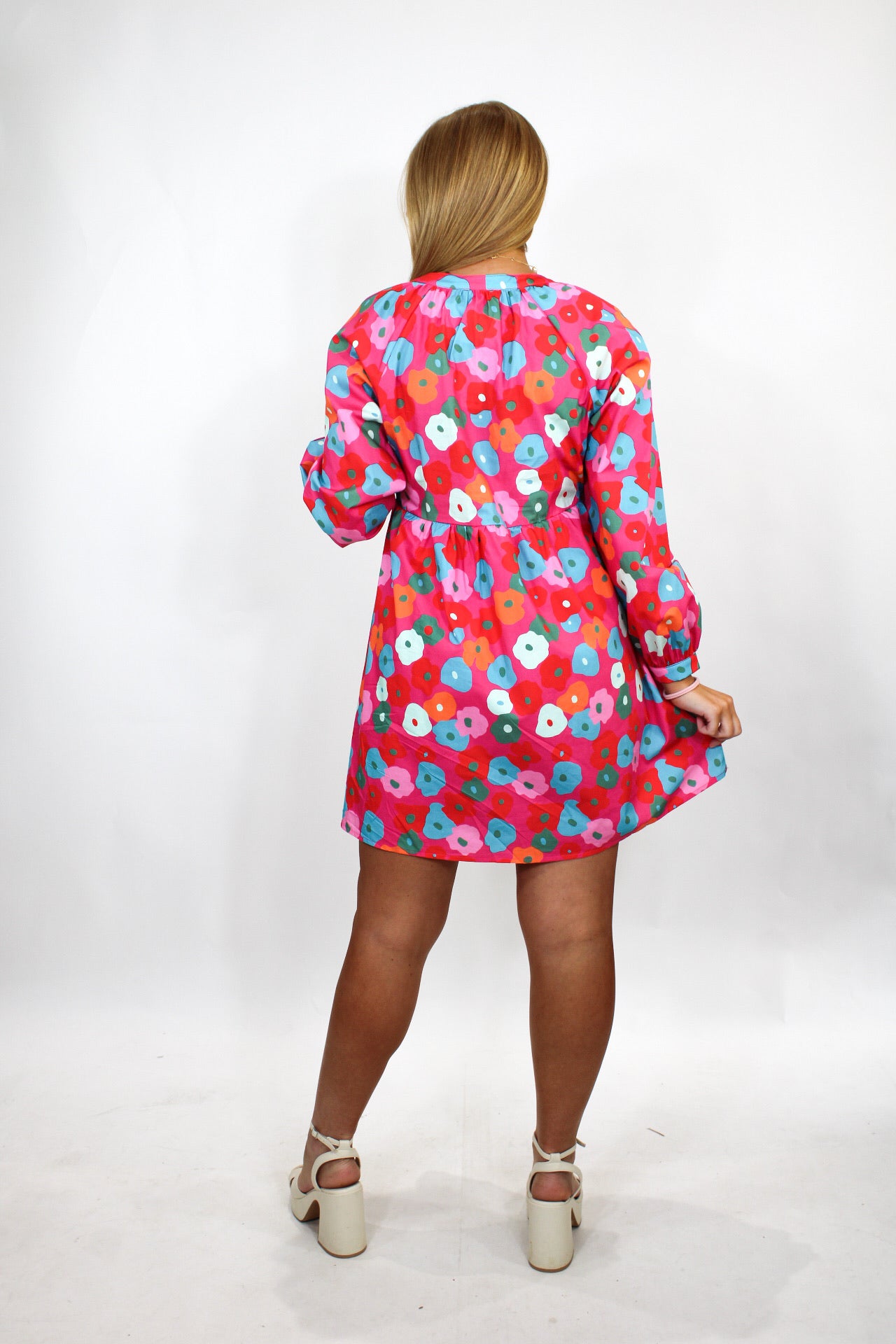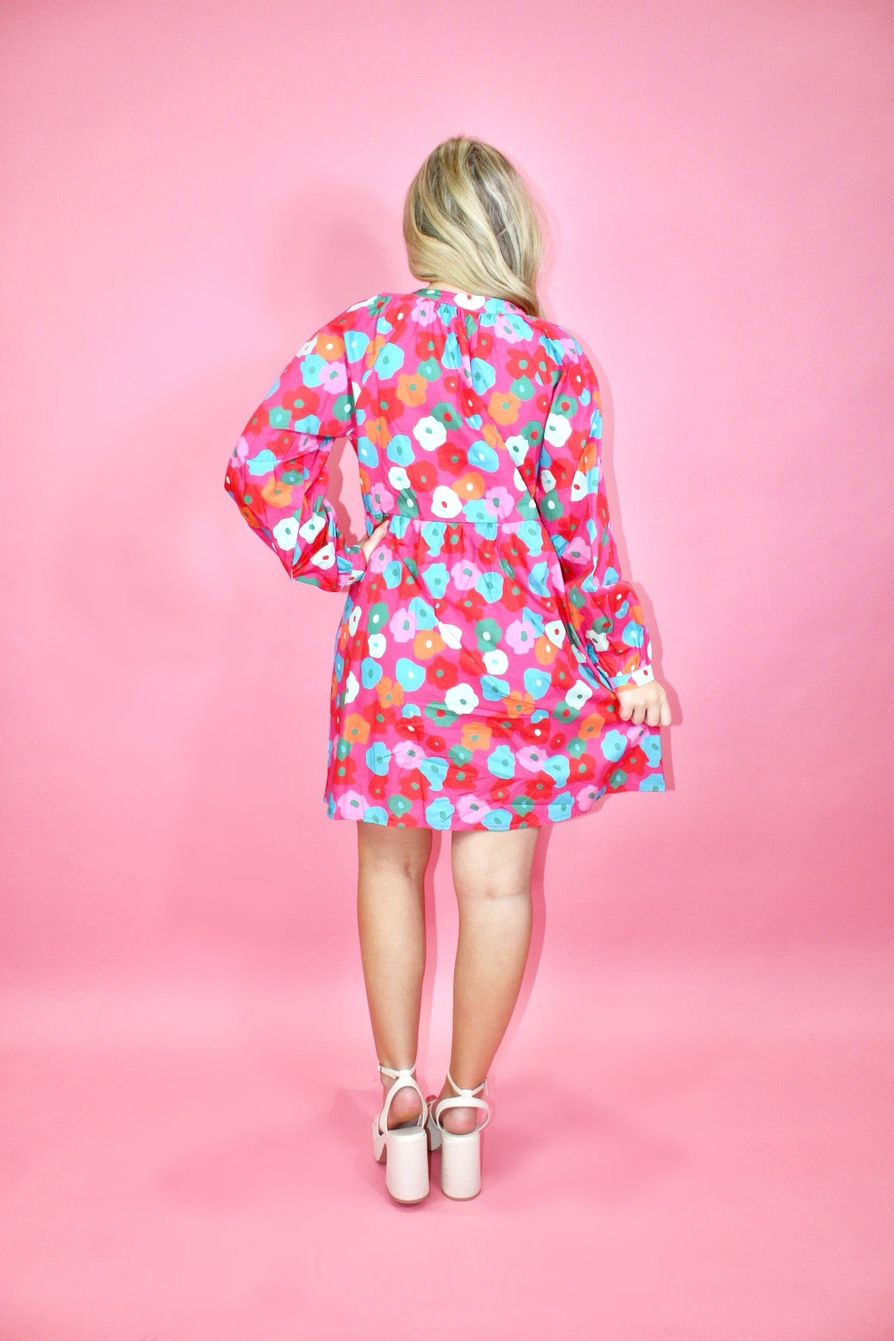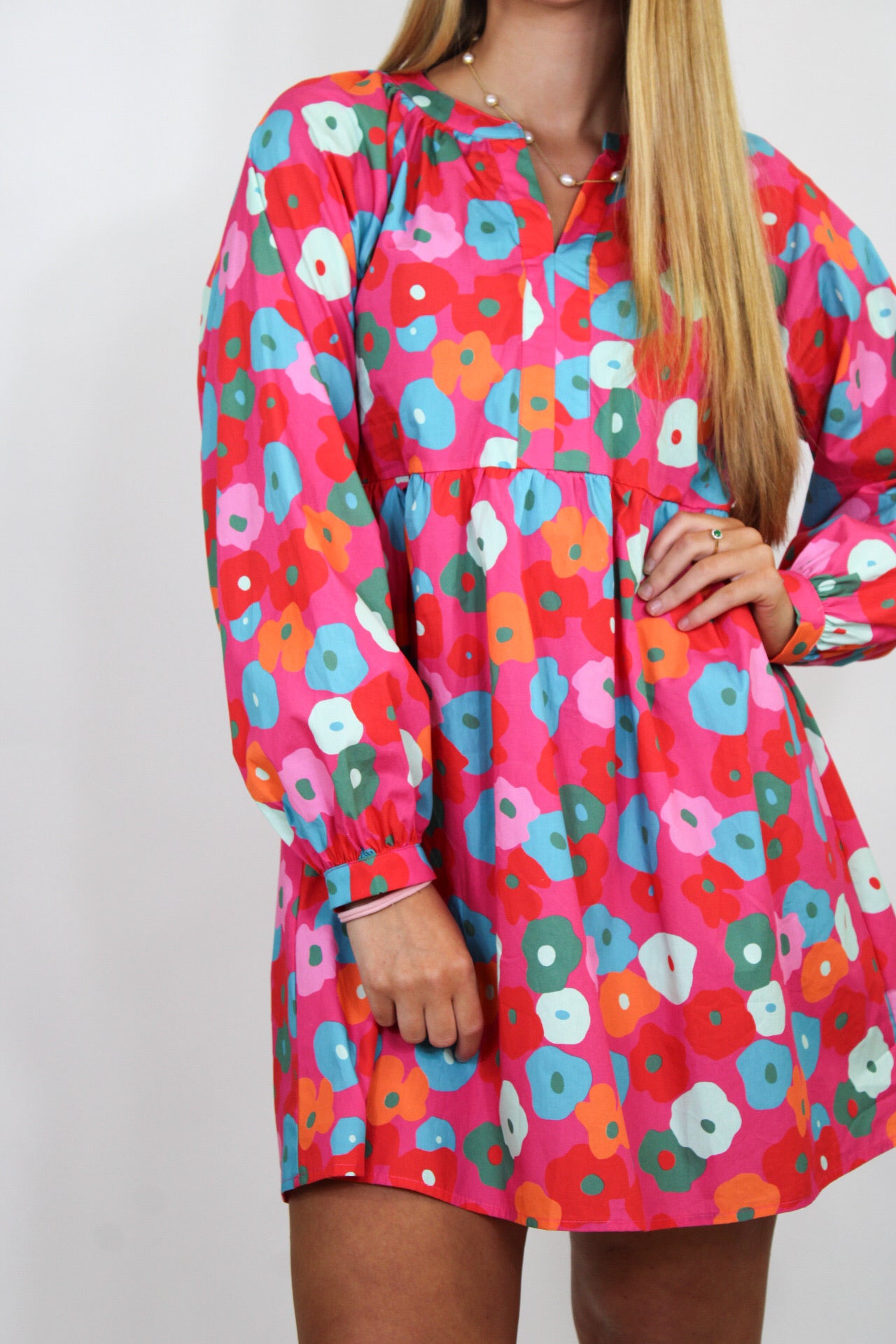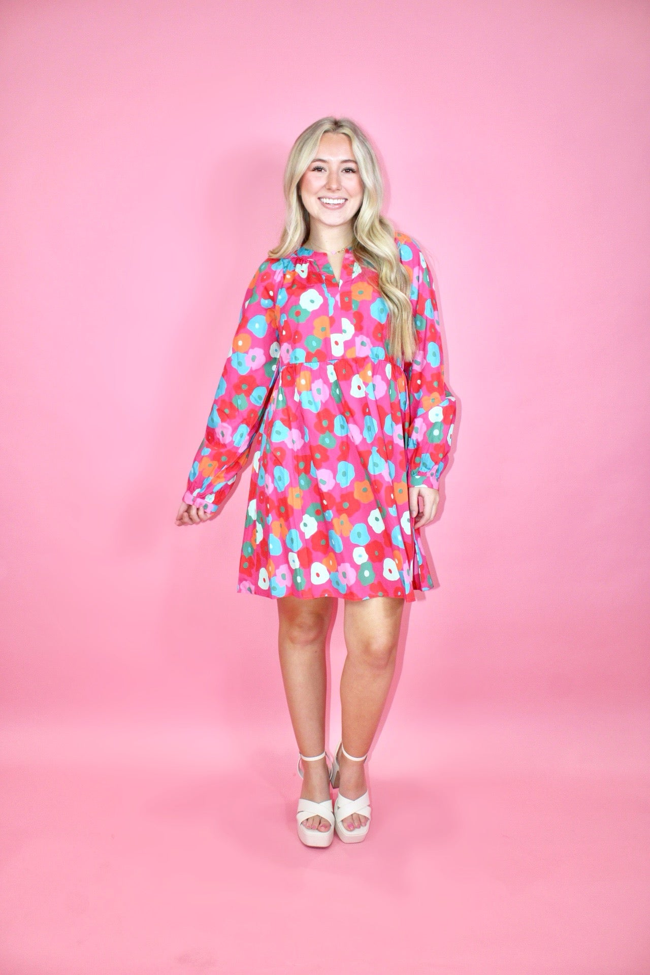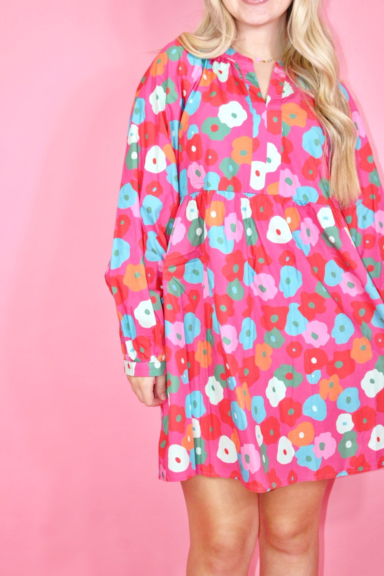 Rachel is 5'3 wearing a size small.Courtney is 5'6 wearing a size medium.- Pink Multicolor Floral Mini.- Long sleeve.- True To Size.