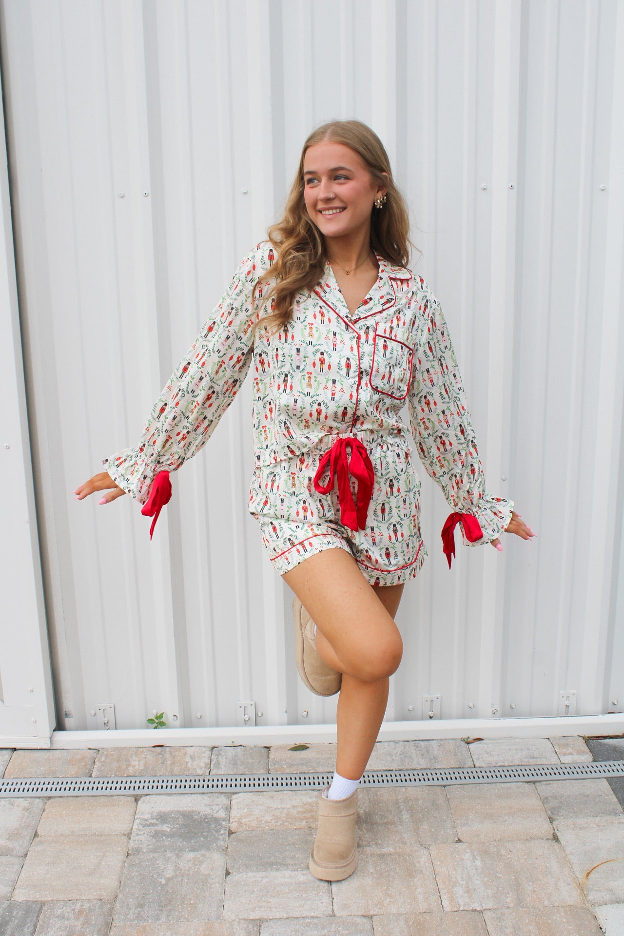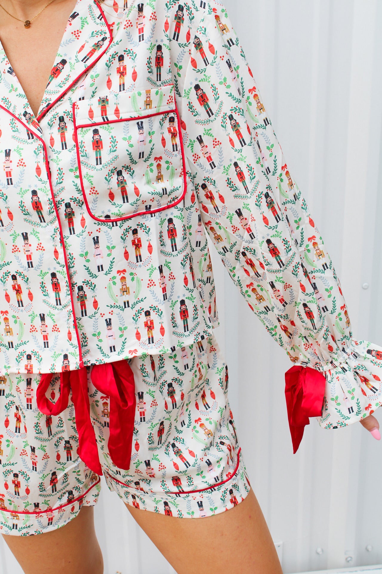 Morgan is 5'4 wearing a size small.- Satin bows.- Buttons down.- Adjustable waistband.