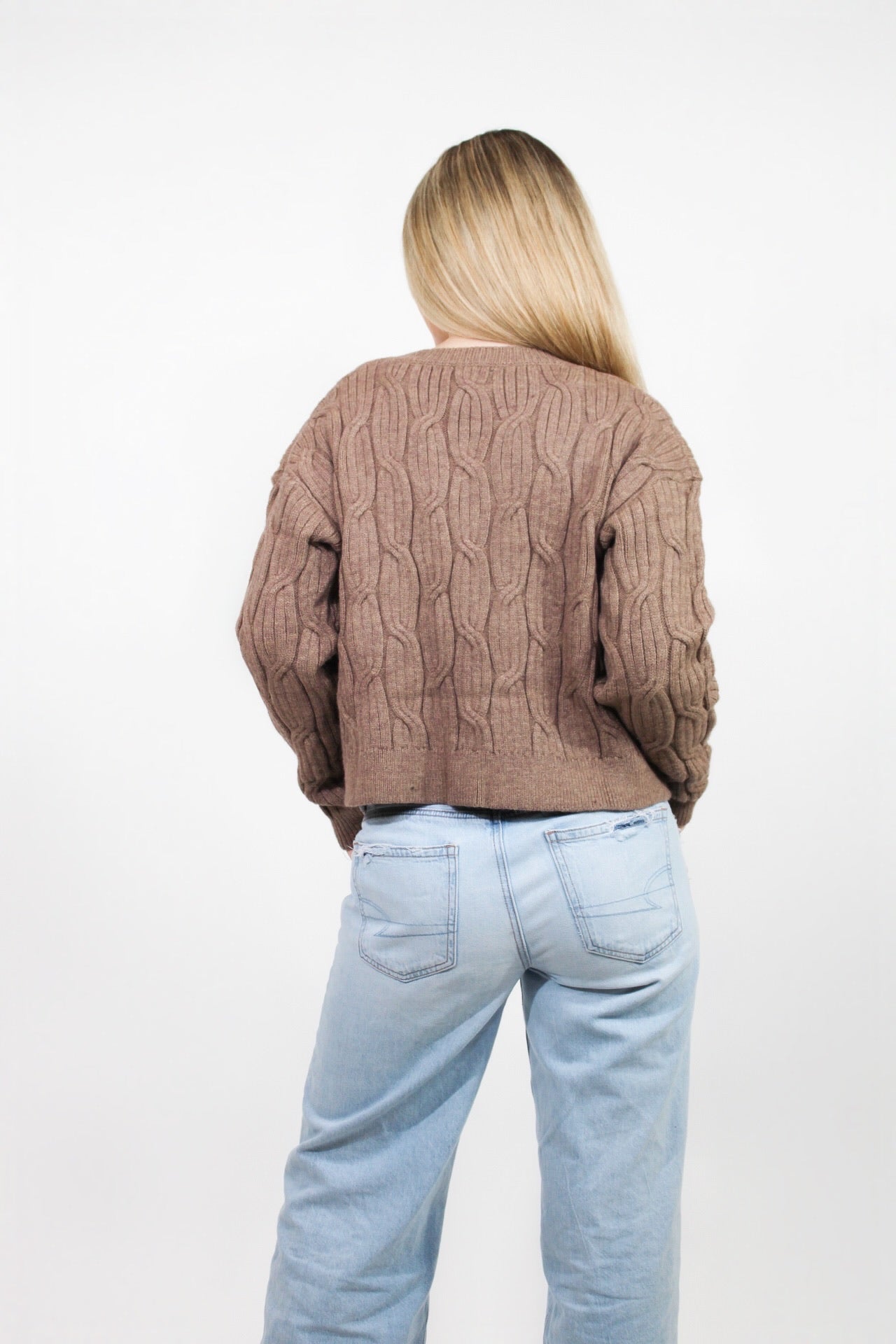 Rachel is 5'3 wearing a size small.- Brown Sweater.- Bow Detailing.- True to Size.