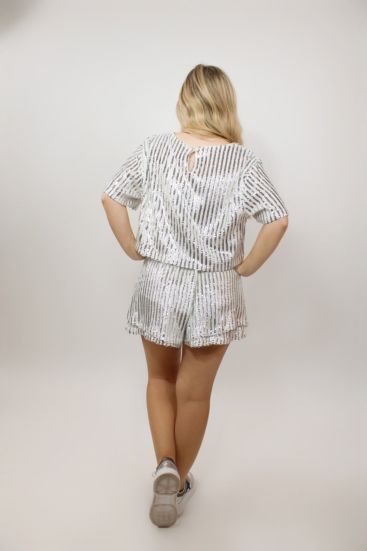 Rachel is 5'3 wearing a size small.- White and silver sequin set- True to size