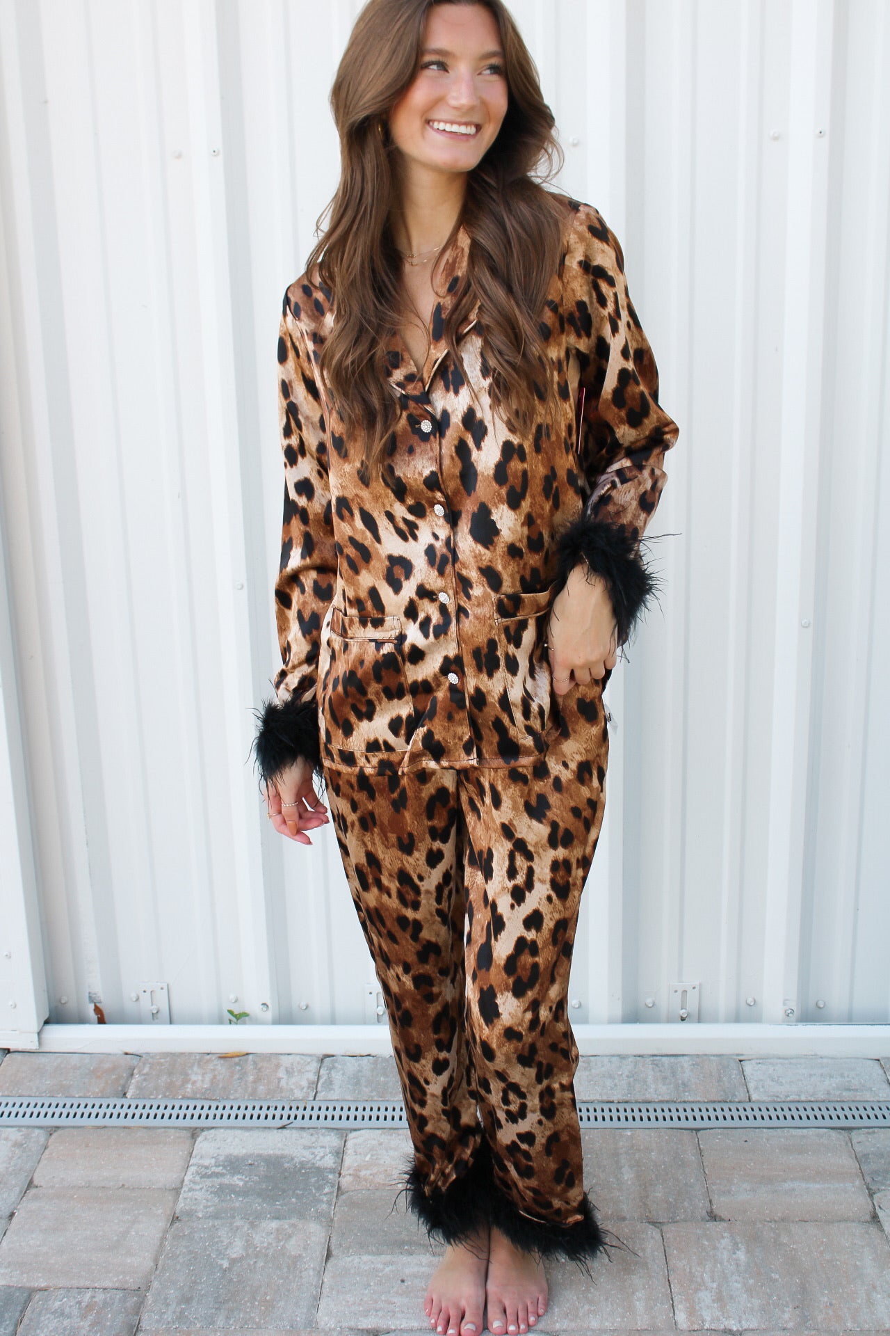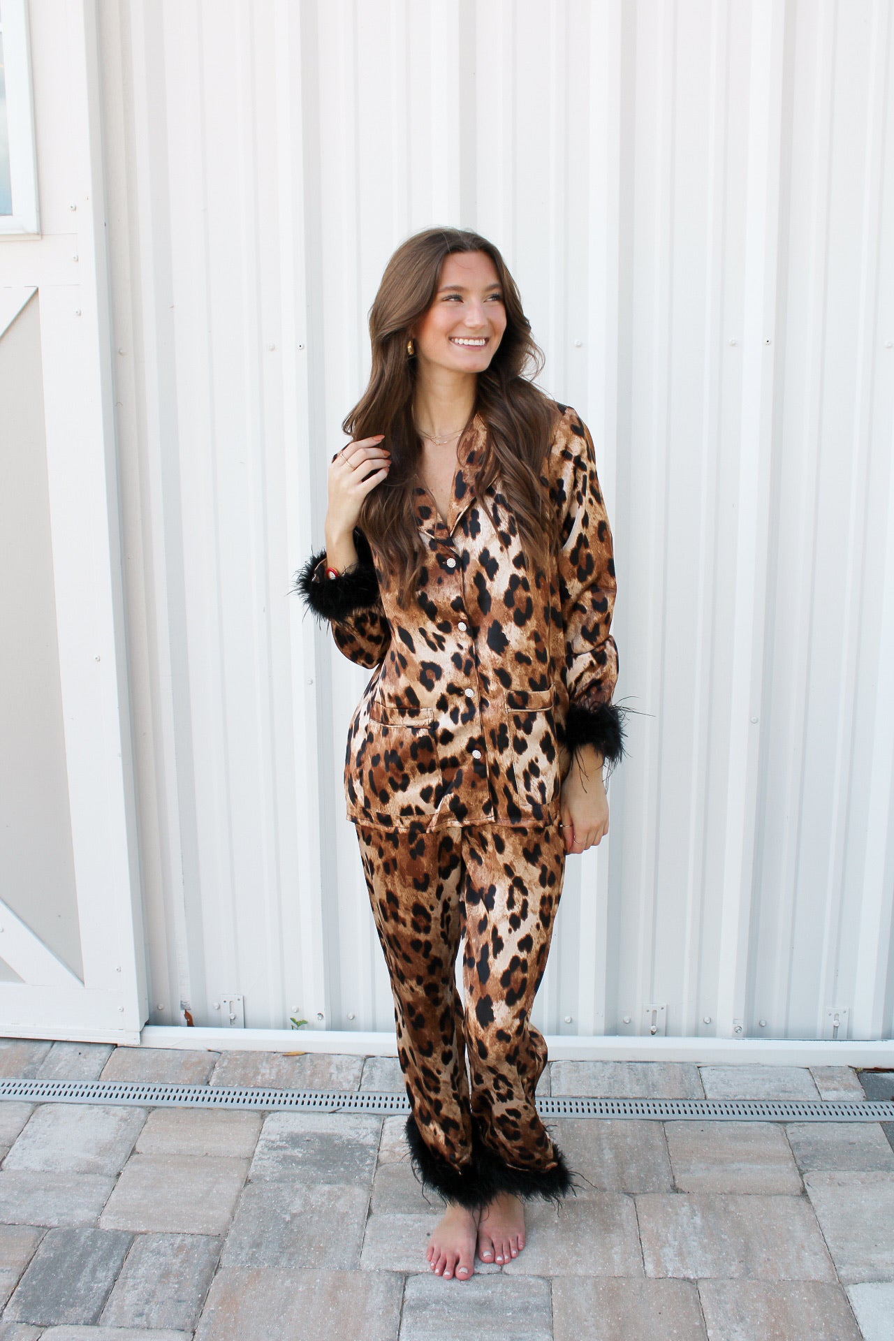 Emily is 5'6 wearing a size small.- Feather Cuffs.- Satin Pajamas.- True to Size.