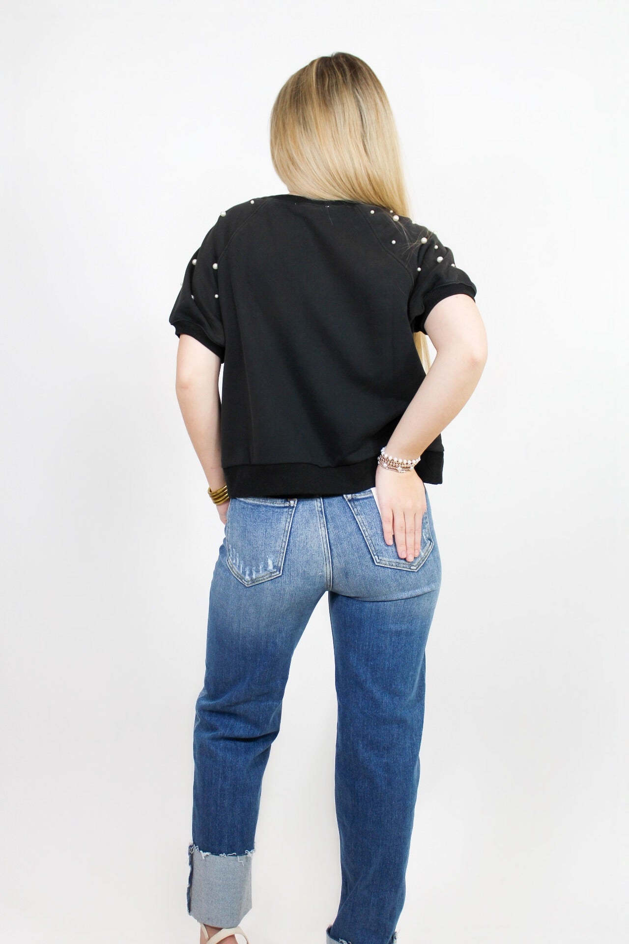 Rachel is 5'3 wearing a size small.- Black Top with Pearls.- Puff Sleeves.- True to Size.