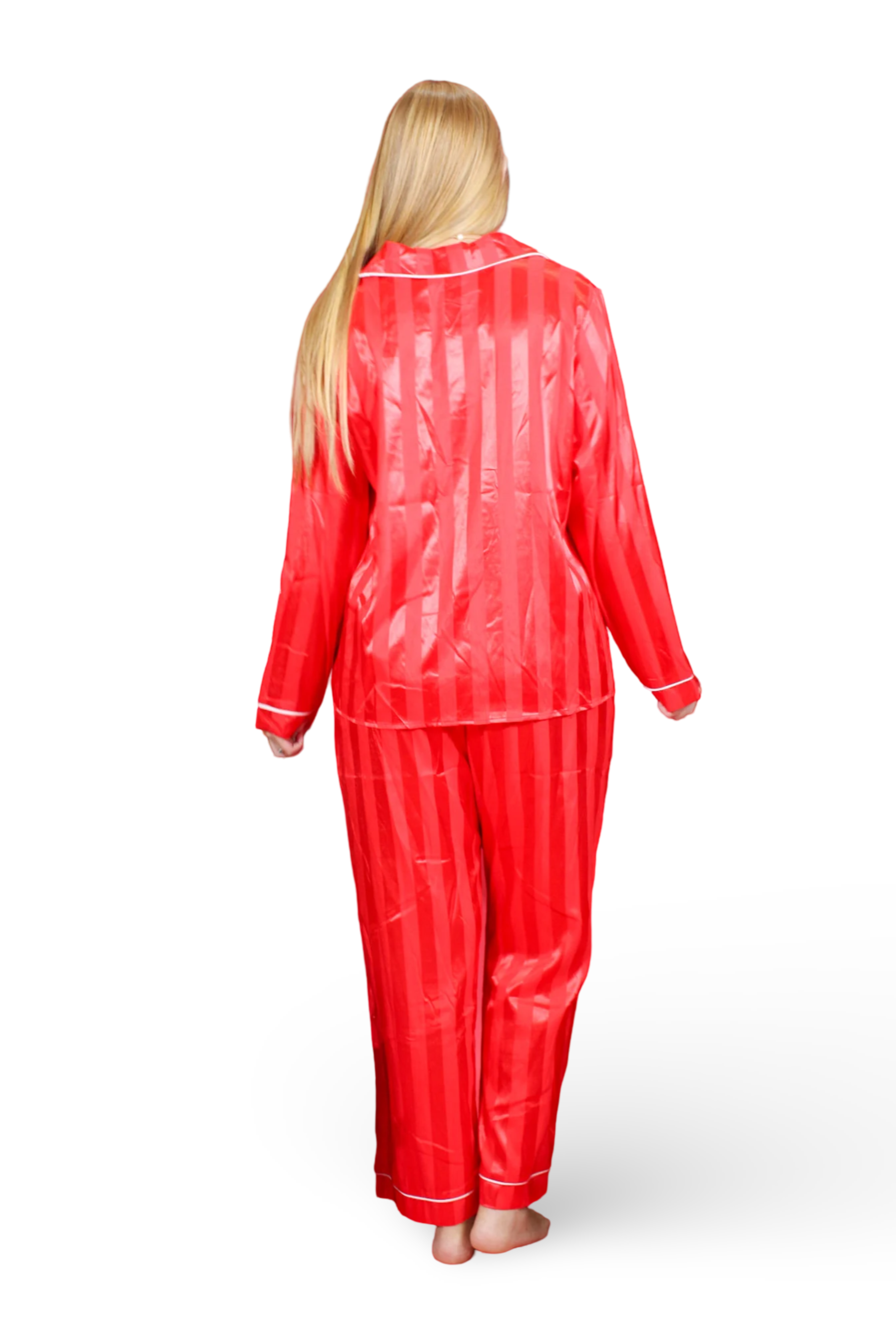 Courtney is 5'6 wearing a size small.Rachel is 5'3 wearing a size small.Red silk pajamas with white pipingTrue to size