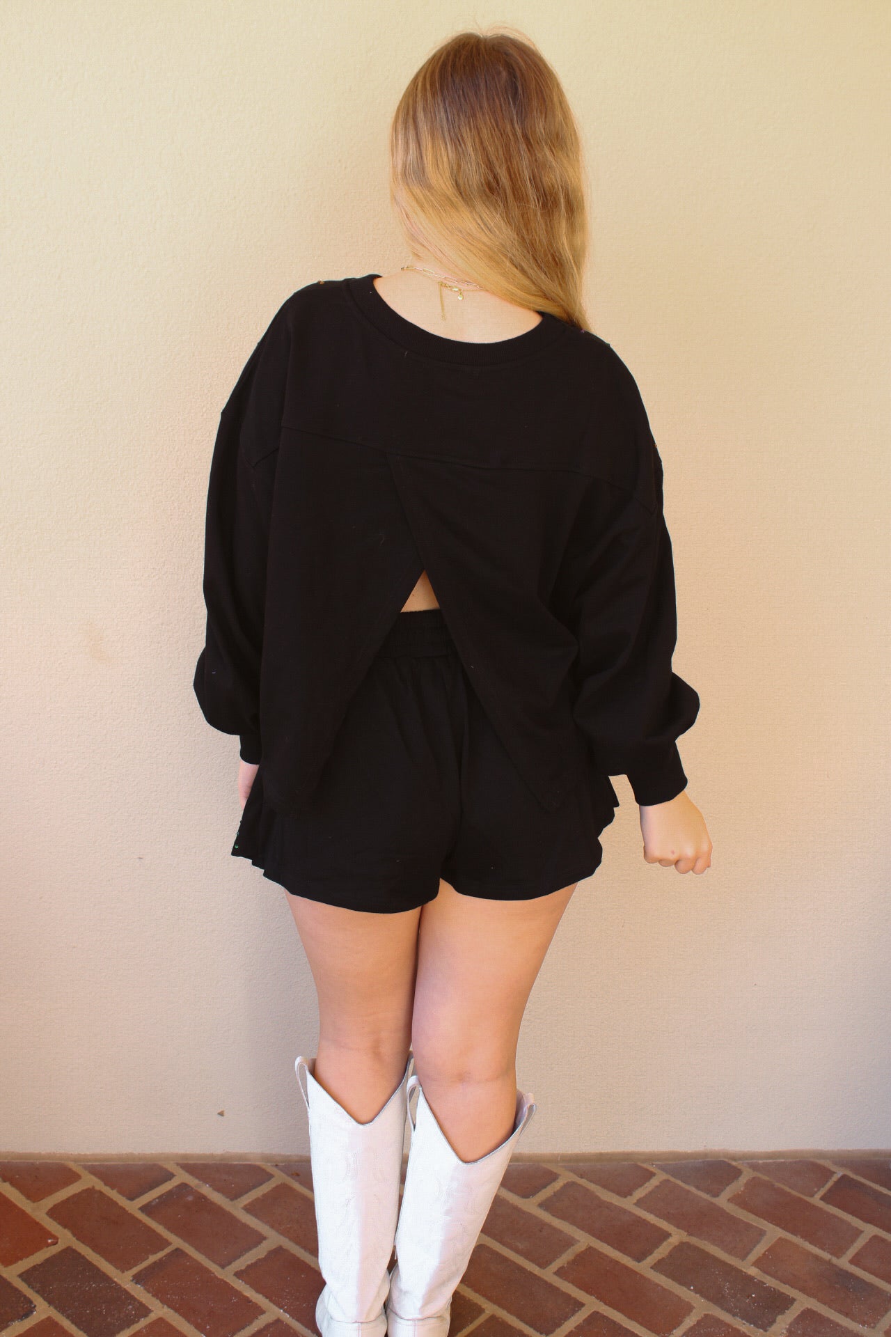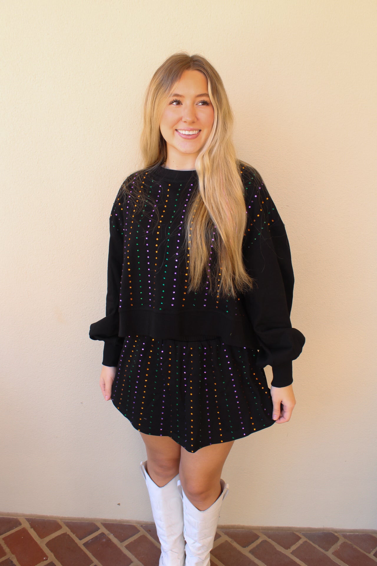 Rachel is 5'3 wearing a size small.- Open back top.- Skort style bottom.- Rhinestone detailing.