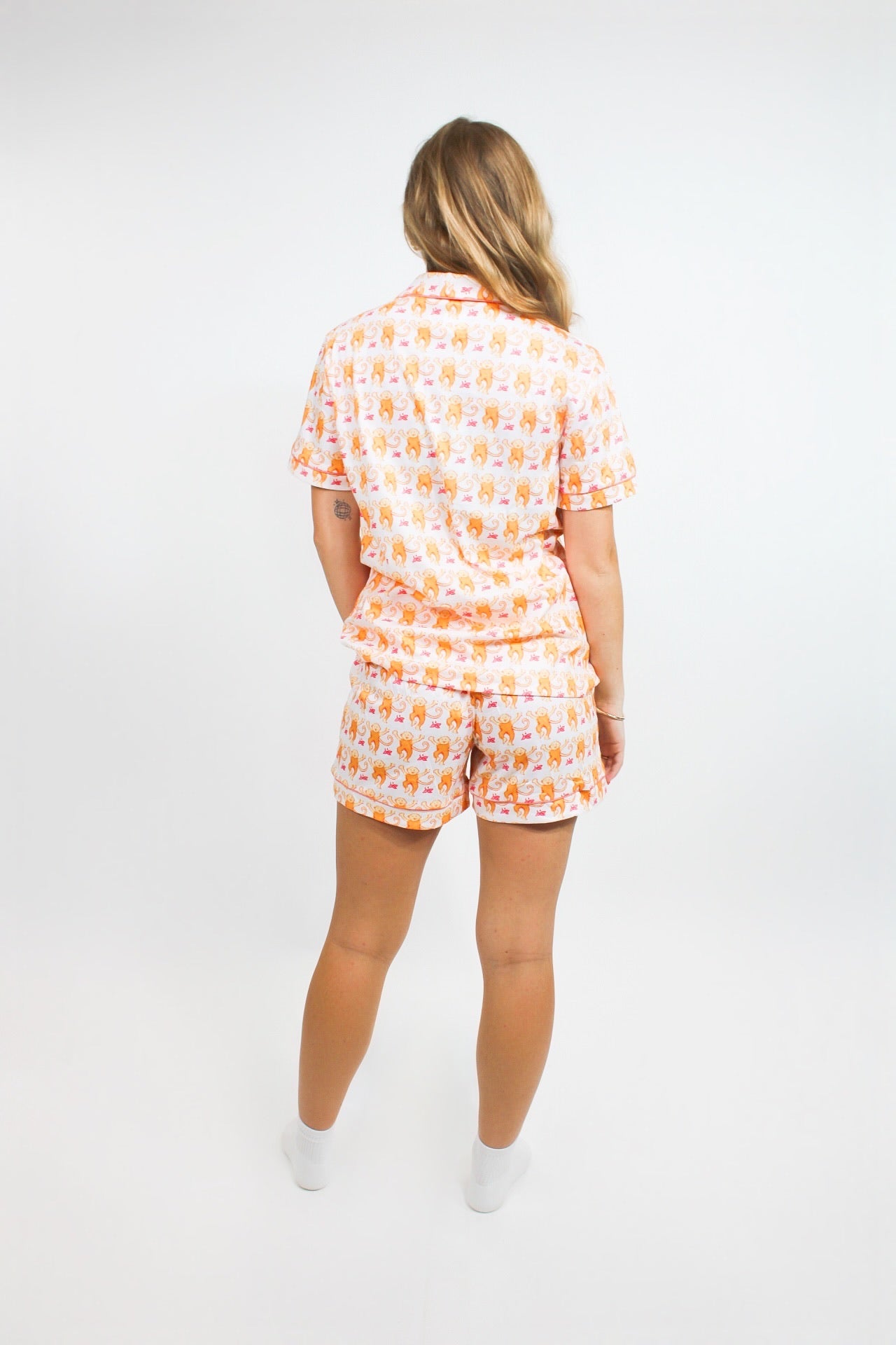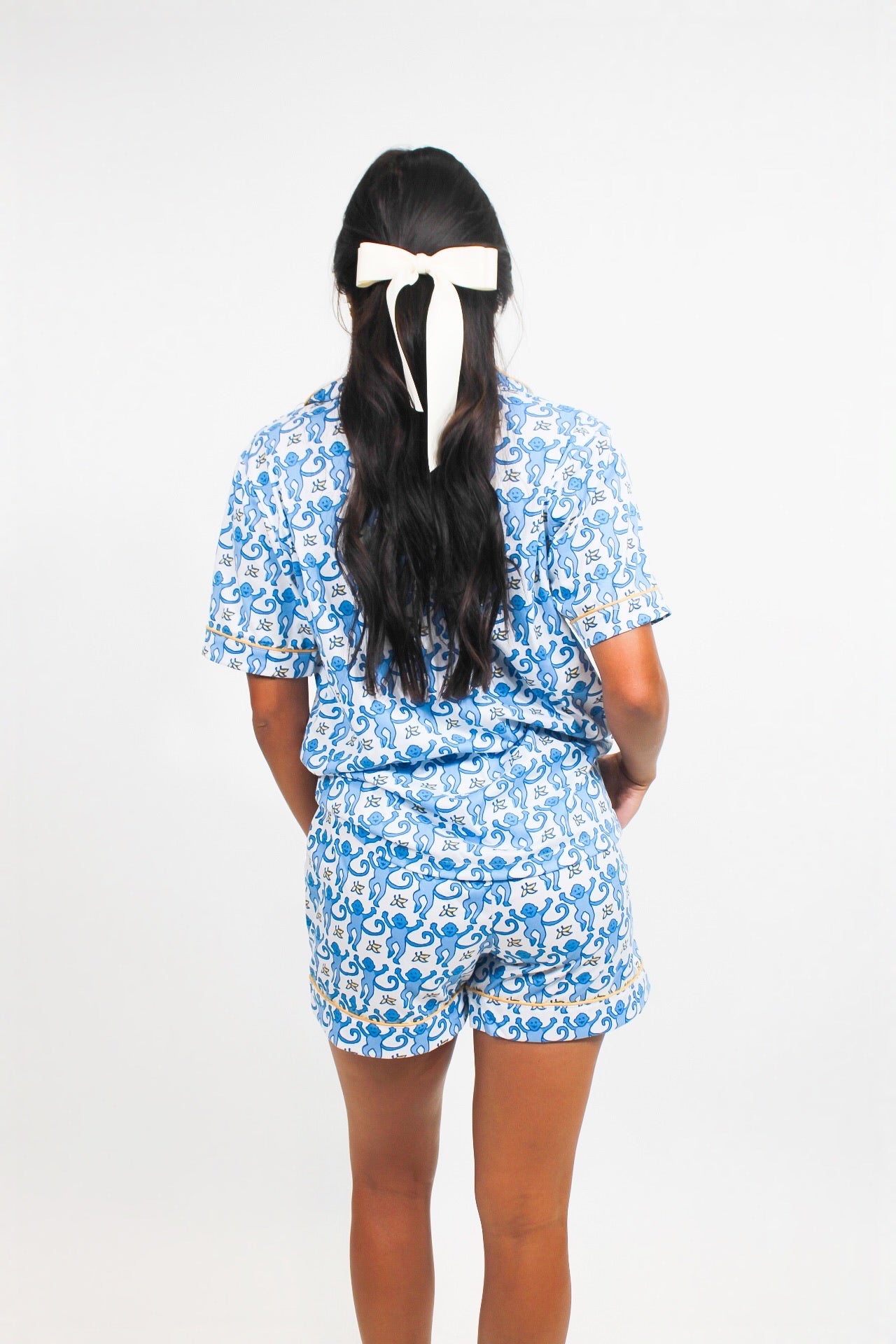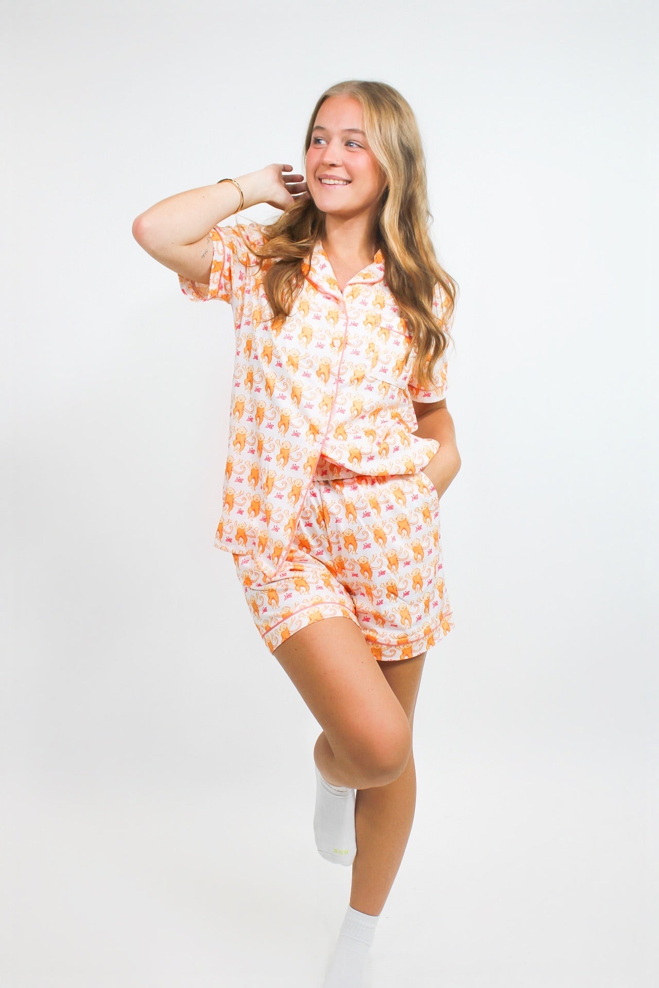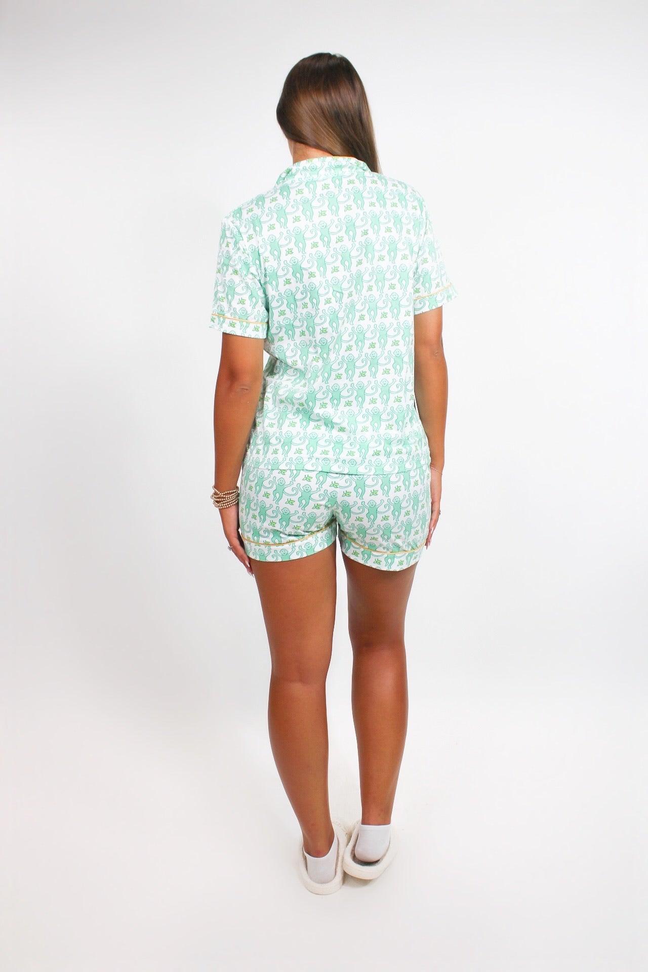 Chloe is 5'2 wearing a size small.Morgan is 5'4 wearing a size small.Shayla is 5'10 wearing a size large.- Roller Rabbit Dupe.- Bottoms Have Pockets.- Polyester Material.