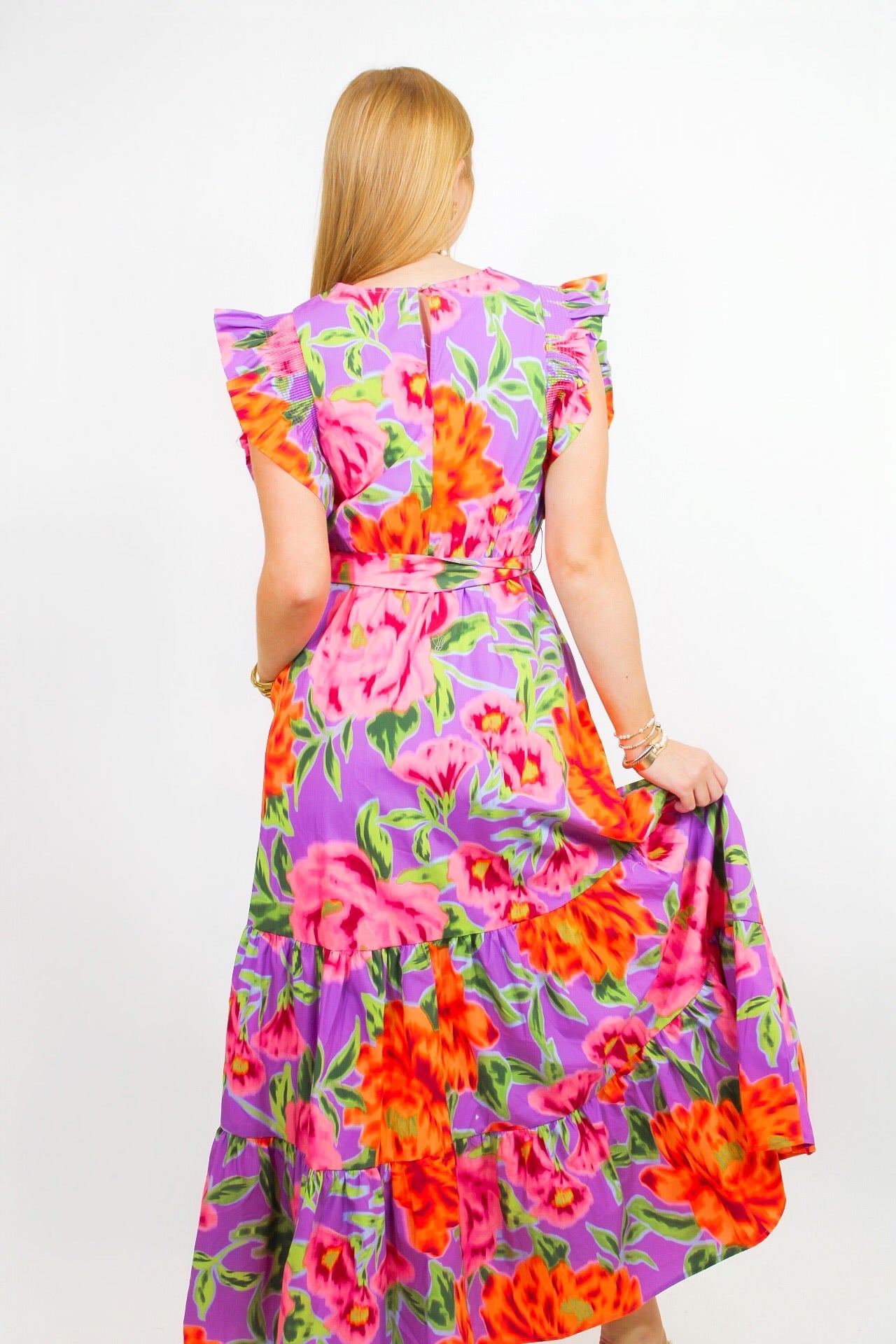 Courtney is 5'6 wearing a size small.- Ruffled Sleeves.- Belted Maxi.- True to Size.