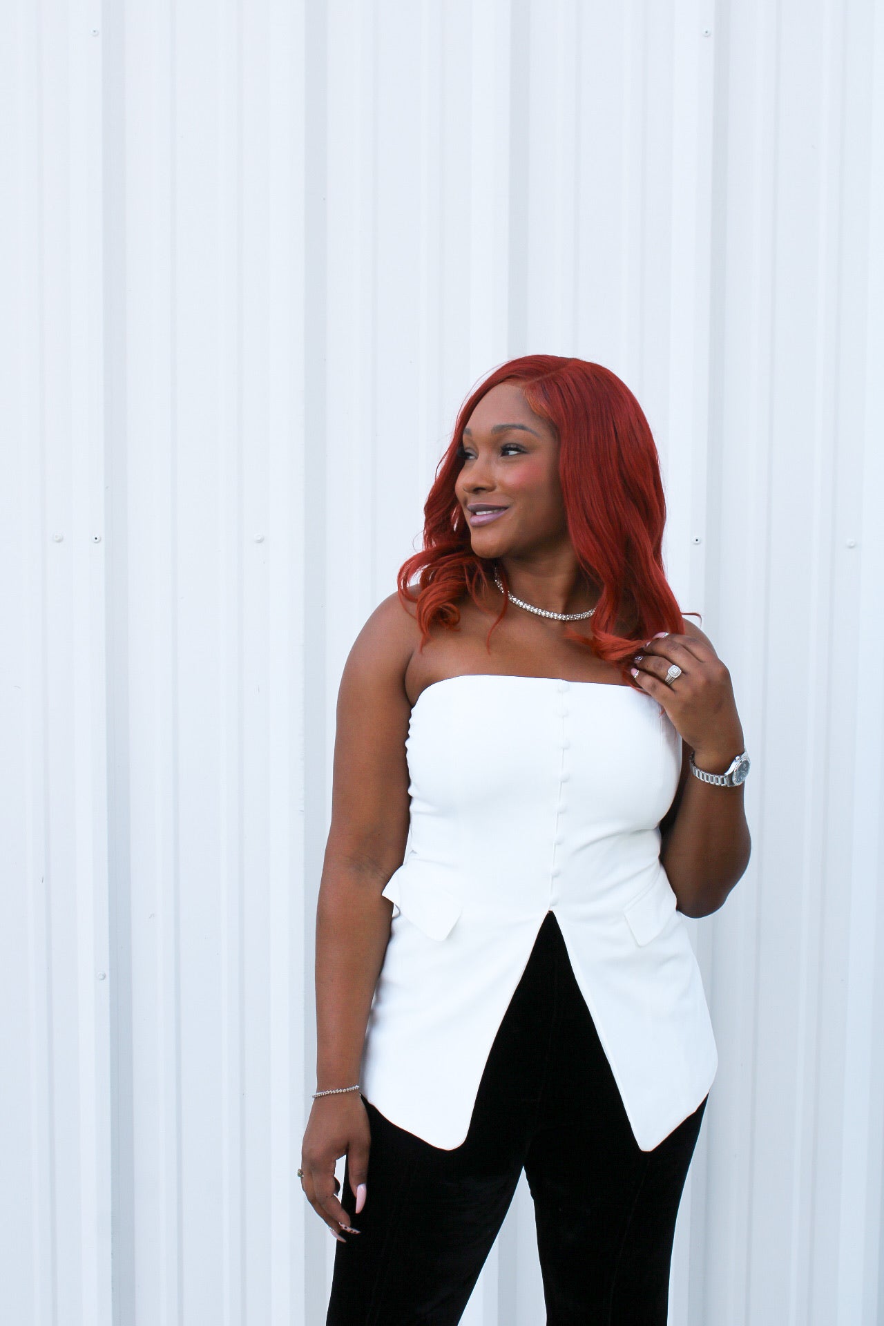 Medina is 5'5 wearing a size large.- Zips up the back.- Strapless.- True to Size.